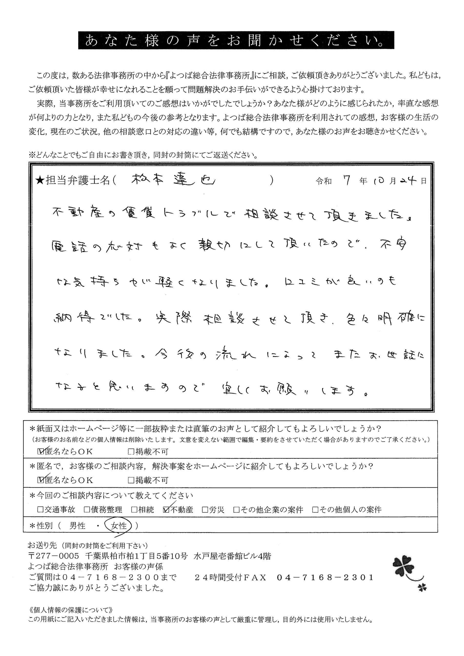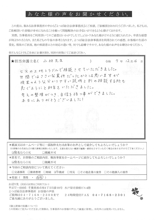 当事務所にて不動産トラブルのご相談にいらっしゃった方々から頂いたアンケートより、直筆のメッセージ・回答を一部ご紹介させていただきます。